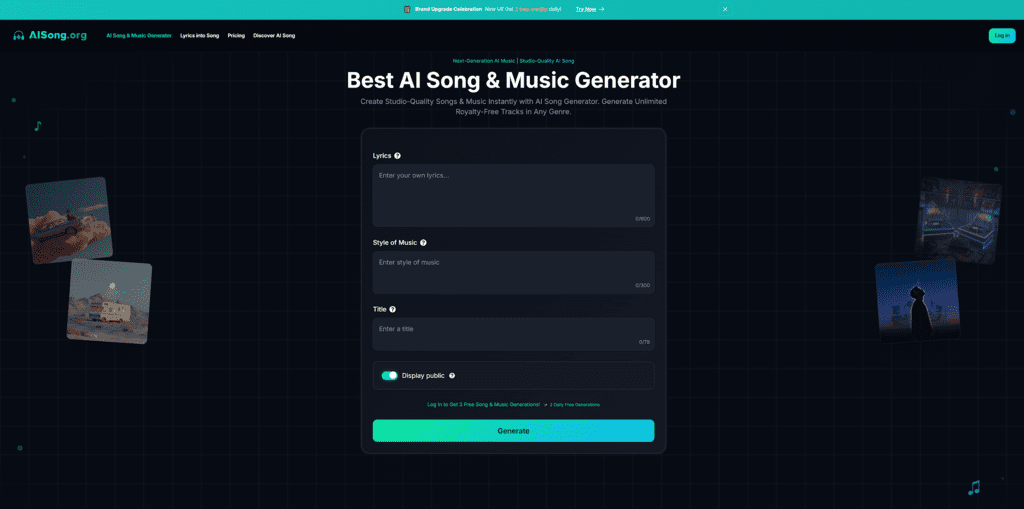 Register with AI Song Generator now and receive 3 free song generations, plus 2 free daily generation credits. No credit card required, no music theory knowledge needed—just your creativity and ideas. Let AI Song’s lyrics-to-music technology transform your words into beautiful melodies and open a new chapter in your music creation.
